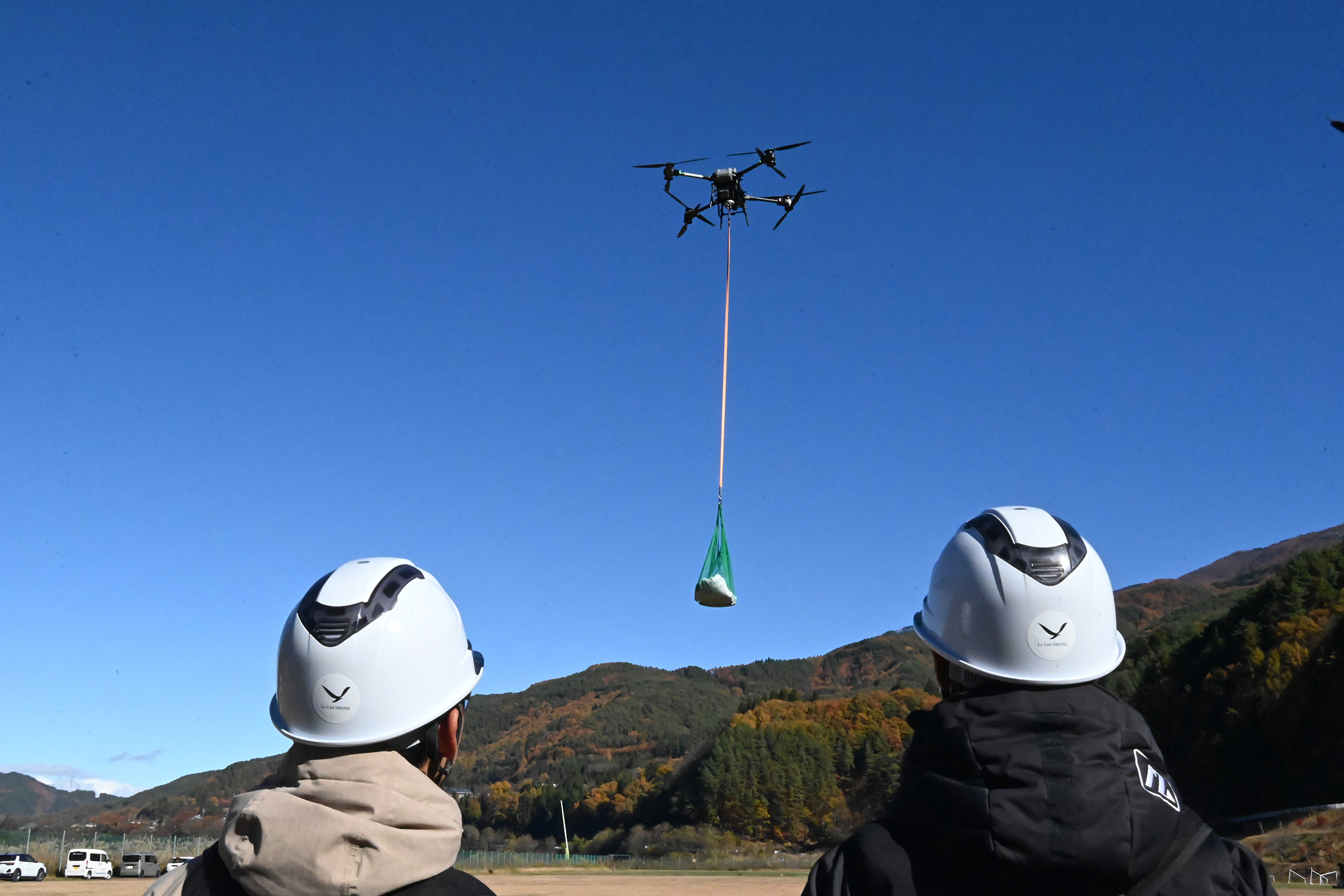 鉄塔資材運搬や林業の資材運搬など、高低差のある重量物運搬に特化しております。ドローンが運ぶことにより人が物を運ぶよりも事故のリスクや人の負担の軽減が実現可能となりました。弊社では年間約50t以上もの資材をドローンで運搬しております。